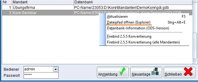 Mit der rechten Maustaste auf den Datenbankpfad. Es erscheint ein kleines Popupfenster: