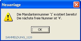 Wird eine Mandantennummer eingetragen die schon existiert, erhält man eine Meldung das diese Nummer schon vorhanden ist und welche die nächst freie Nummer ist.