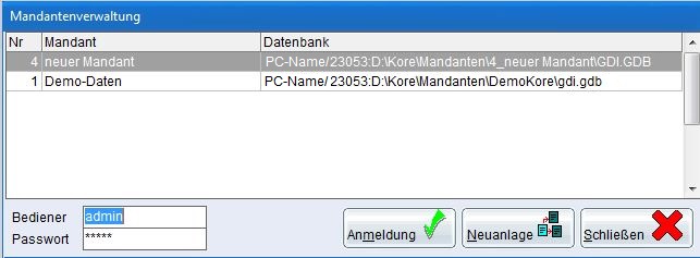 Der eingegebene Bediener muss in dem gewählten Mandanten angelegt sein, damit der Zugang gewährt wird.