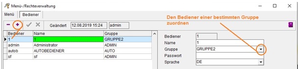 Auf der Karte Bediener können Bediener angelegt und einer bestimmten Gruppe zugeordnet werden.