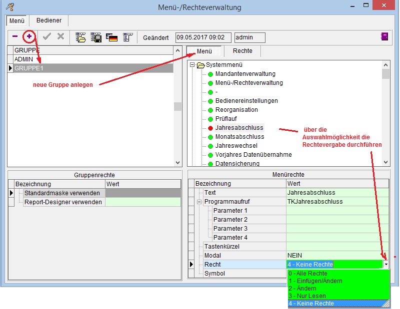 Alternativ kann die Änderung im unteren Bereich über die Menürechte erfolgen.