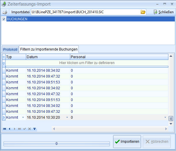 Bei wiederholtem Import werden bereits bestehende Personalnummern überschrieben und neu hinzugekommene angehängt. Die Daten, die im Zeiterfassungsprogramm ergänzt wurden, aber nicht in der Importdatei vorhanden sind, werden nicht überschrieben. Felder, die in der Importdatei enthalten sind, werden überschrieben.