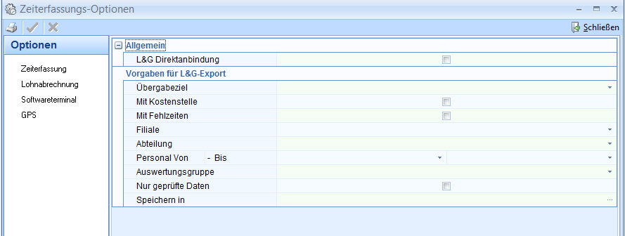 Übergabeziel: Wahlweise "Stundenerfassung", "Bruttolohnerfassung" "Stunden- und Bruttolohnerfassung", abhängig davon, für welchen Bereich in Lohn & Gehalt die Daten exportiert werden sollen.