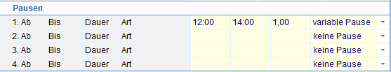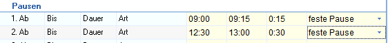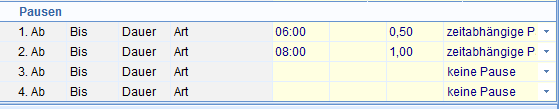 In jedem Tageszeitmodell lassen sich bis zu vier Pausen definieren. Hierbei kann jeweils der Zeitraum (Ab, bis), die Dauer und die Art der Pause festgelegt werden. Es wird zwischen drei Pausenarten unterschieden: